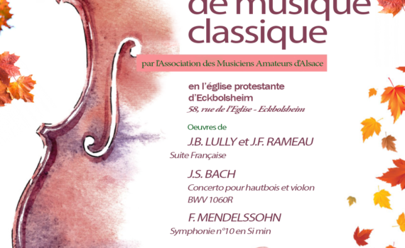 Le samedi 2 décembre à 17h en l’église d’Eckbolsheim, nous vous proposons un magnifique concert de musique classique par l’Association des Musiciens amateurs d’Alsace. Venez découvrir des œuvres de Lully, Rameau, Bach et Mendelssohn ! Entrée libre – plateau.